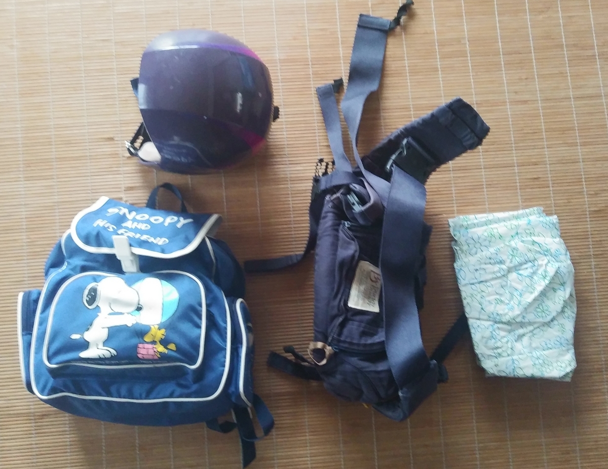 甥っ子が持つリュック、ヘルメット。