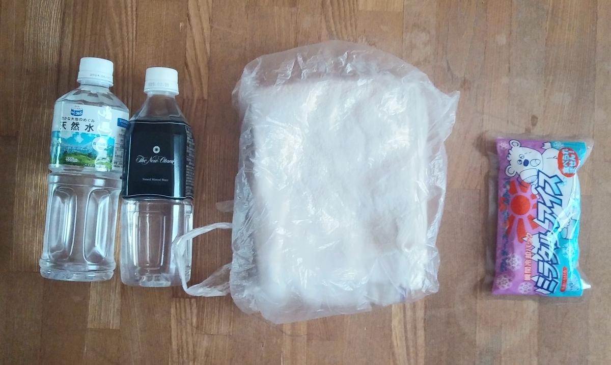 ミネラルウォーター、タオル、保冷剤
